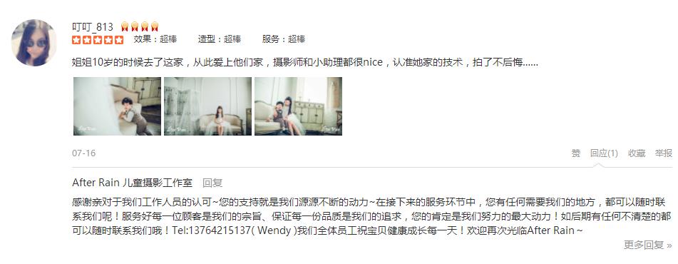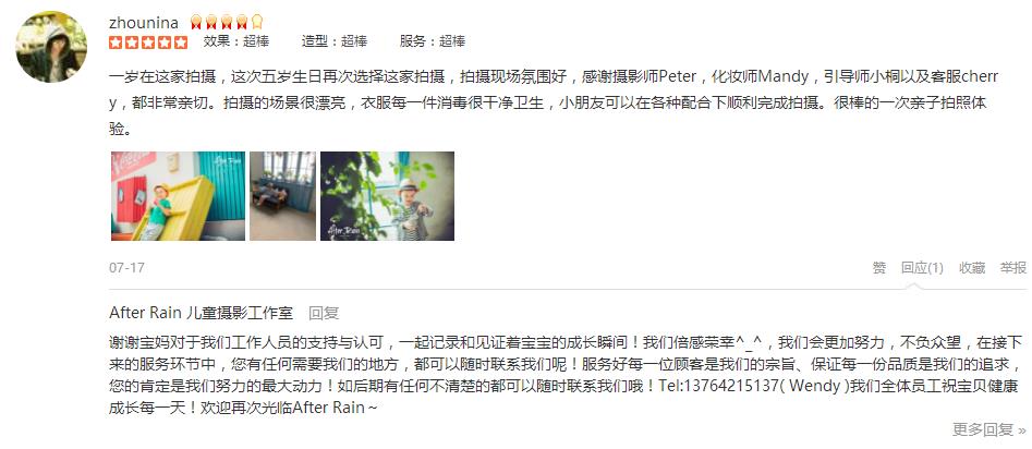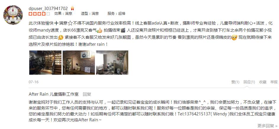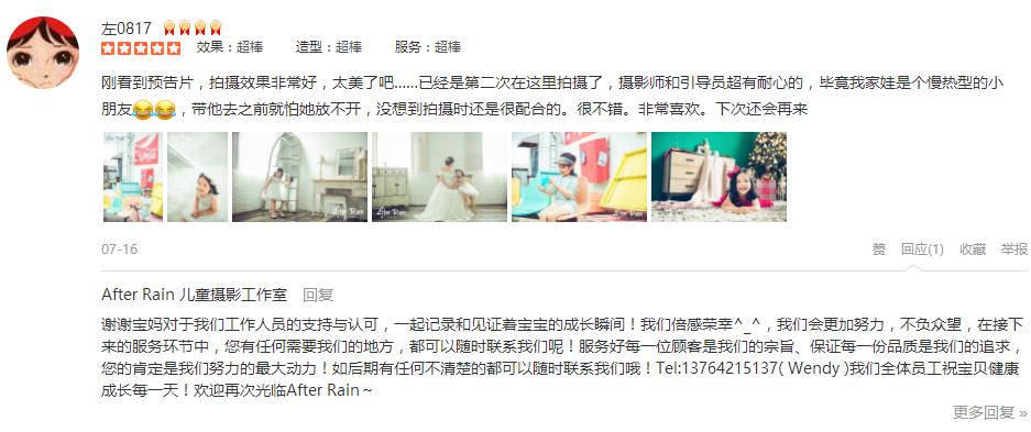此次体验愉快➕满意⭐️不得不说国内服务行业效率极高!线上客服ada认真+熬夜,摄影师专业有经验,儿童导师瑞利耐心+活泼,化妆师mandy速度,店长66漂亮又客气强 拍摄结束🎬 人还没离开店照片和相框已经送上,才离开店到楼下打...