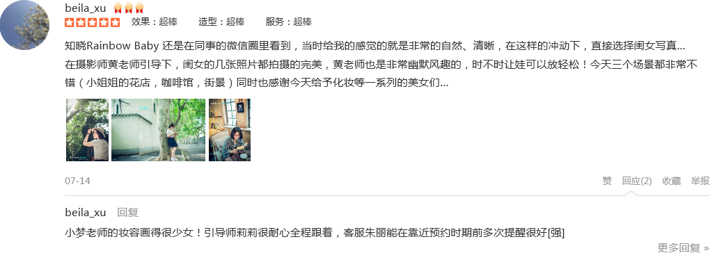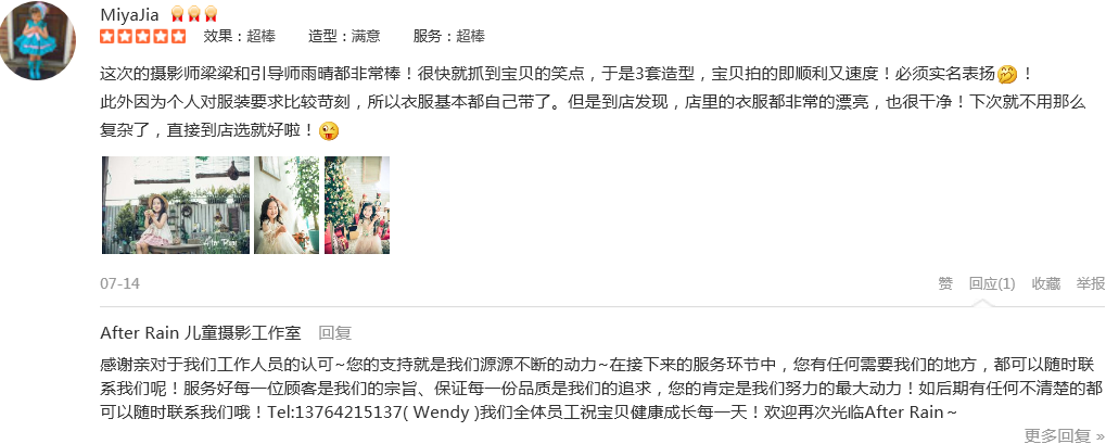 这次的摄影师梁梁和引导师雨晴都非常棒!很快就抓到宝贝的笑点,于是3套造型,宝贝拍的即顺利又速度!必须实名表扬偷笑! 此外因为个人对服装要求比较苛刻,所以衣服基本都自己带了。但是到店发现,店里的衣服都非常的漂亮,...