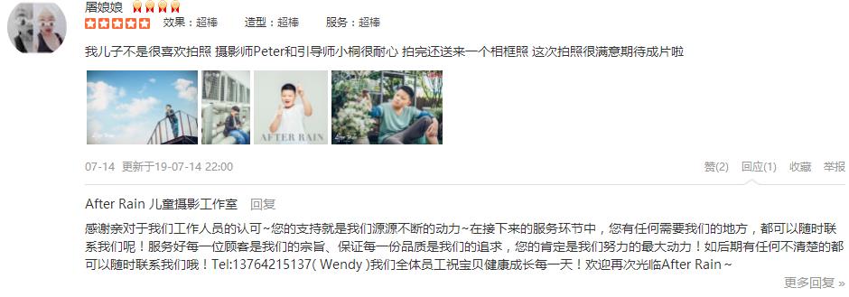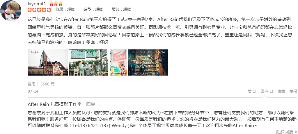 这已经是我们宝宝在After Rain第三次拍摄了!从3岁一直到7岁、After Rain帮我们记录下了他成长的轨迹。第一次亲子婚纱的感动到团结里帅气男孩的英姿、每一张照片都那么真情实感且美好。摄影师技术一流、引导师有耐心且专业...