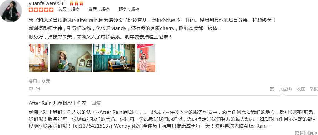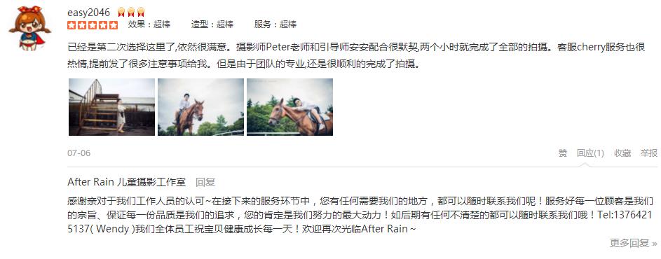 为了和风场景特地选的after rain,因为婚纱亲子比较普及,想拍个比较不一样的。没想到其他的场景效果一样超级美! 感谢摄影师大伟,引导师然然,化妆师Mandy,还有我的客服cherry,耐心态度都一级棒! 服务好,拍摄效果美,果...
