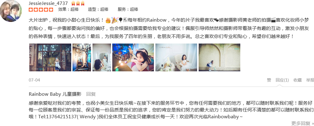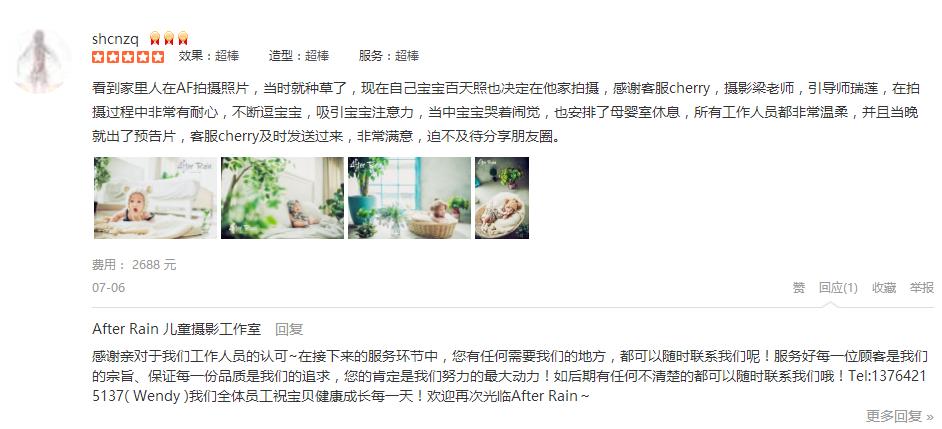 看到家里人在AF拍摄照片,当时就种草了,现在自己宝宝百天照也决定在他家拍摄,感谢客服cherry,摄影梁老师,引导师瑞莲,在拍摄过程中非常有耐心,不断逗宝宝,吸引宝宝注意力,当中宝宝哭着闹觉,也安排了母婴室休息,所有工作...