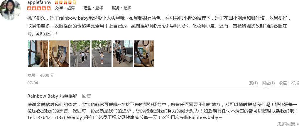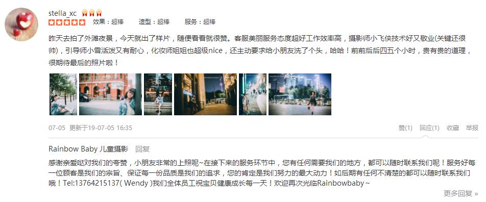 昨天去拍了外滩夜景,今天就出了样片,随便看看就很赞。客服美丽服务态度超好工作效率高,摄影师小飞侠技术好又敬业(关键还很帅),引导师小雪活泼又有耐心,化妆师姐姐也超级nice,还主动要求给小朋友洗了个头,哈哈!前前后后...