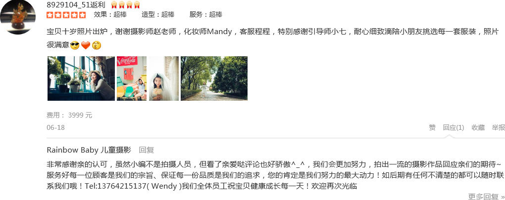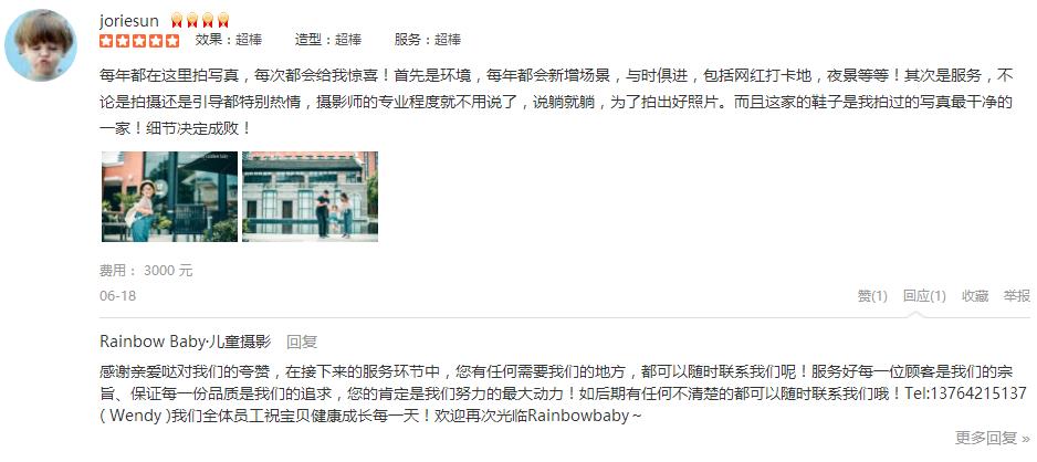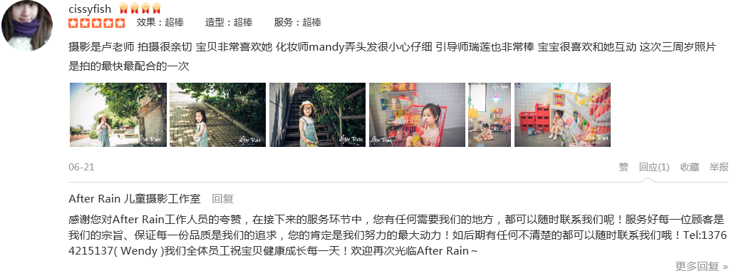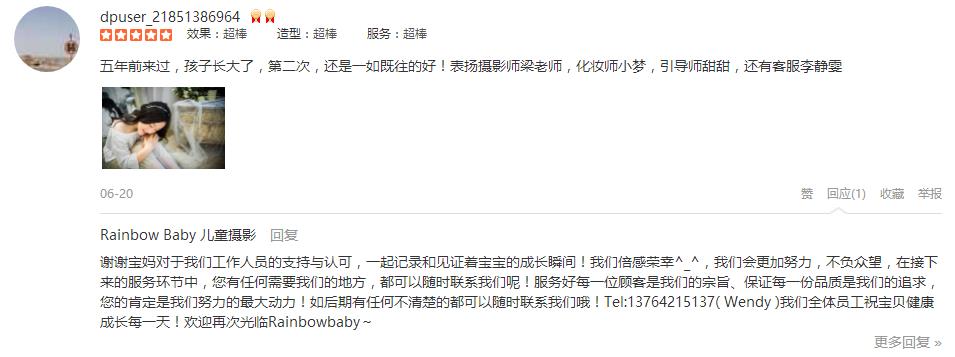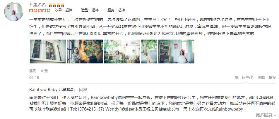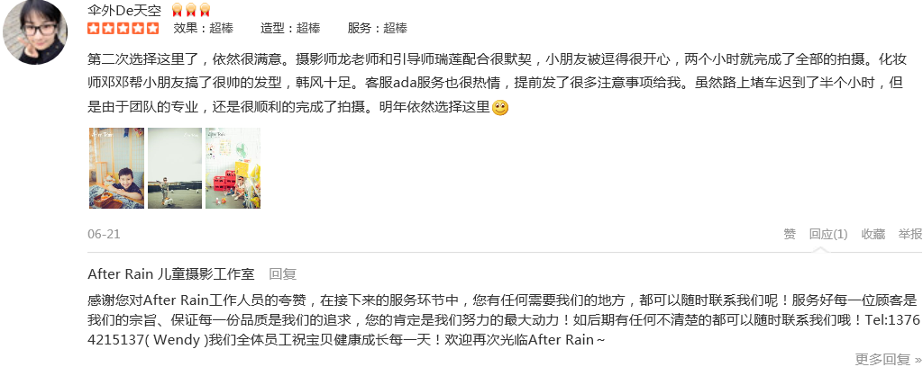 第二次选择这里了,依然很满意。摄影师龙老师和引导师瑞莲配合很默契,小朋友被逗得很开心,两个小时就完成了全部的拍摄。化妆师邓邓帮小朋友搞了很帅的发型,韩风十足。客服ada服务也很热情,提前发了很多注意事项给我。虽然...