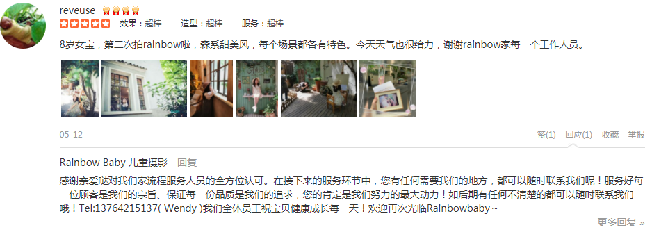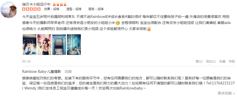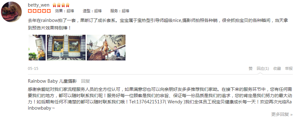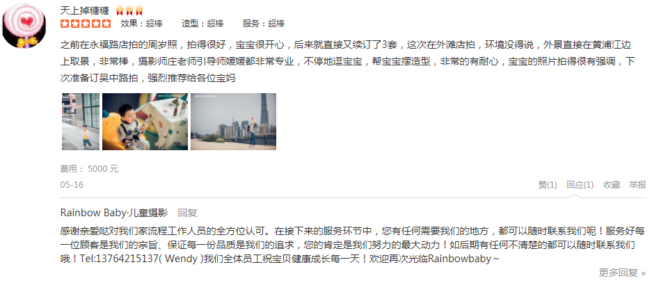 之前在永福路店拍的周岁照,拍得很好,宝宝很开心,后来就直接又续订了3套,这次在外滩店拍,环境没得说,外景直接在黄浦江边上取景,非常棒,摄影师庄老师引导师媛媛都非常专业,不停地逗宝宝,帮宝宝摆造型,非常的有耐心,宝宝...