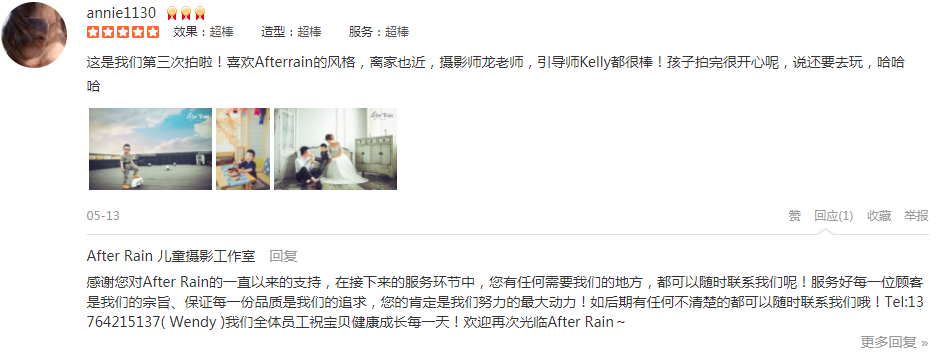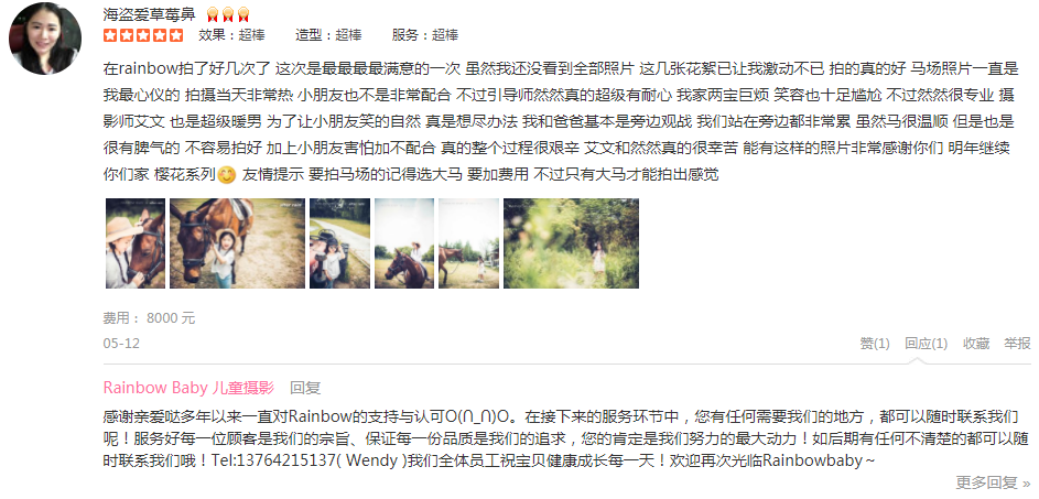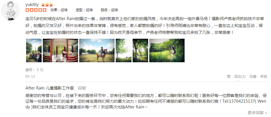 宝贝5岁的时候在After Rain拍摄过一套,当时就喜欢上他们家的拍摄风格,今年决定再拍一组外景马场!摄影师卢燕老师抓拍技术非常好,拍摄的又快又好,照片出来的效果非常捧,很有感觉,家人都赞拍摄的好!引导师雨晴也非常有耐...
