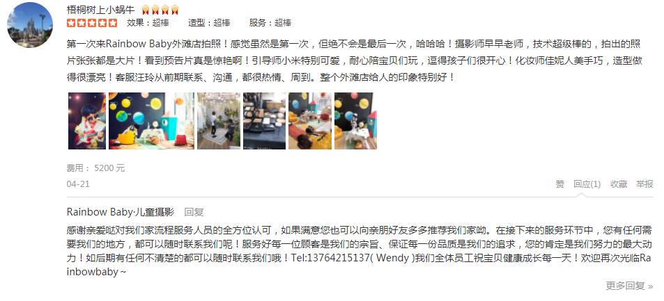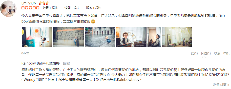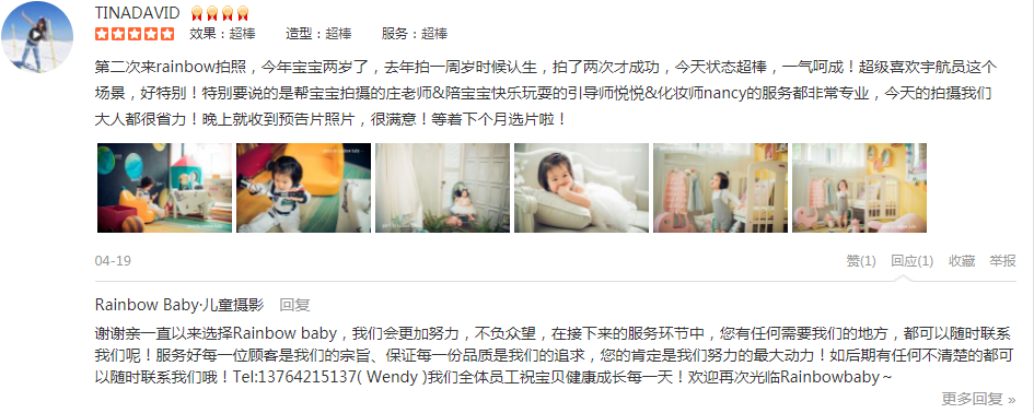 第一次来Rainbow Baby外滩店拍照!感觉虽然是第一次,但绝不会是最后一次,哈哈哈!摄影师早早老师,技术超级棒的,拍出的照片张张都是大片!看到预告片真是惊艳啊!引导师小米特别可爱,耐心陪宝贝们玩,逗得孩子们很开心!化妆...