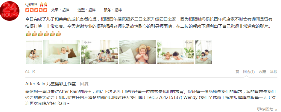 今日完成了儿子和弟弟的成长套餐拍摄,相隔四年感慨颇多三口之家升级四口之家,因为相隔时间很长四年间店家不时会有询问是否有拍摄打算,非常负责。今天谢谢专业的摄影师梁老师以及热情耐心的引导师雨晴,在二位的帮助下顺...