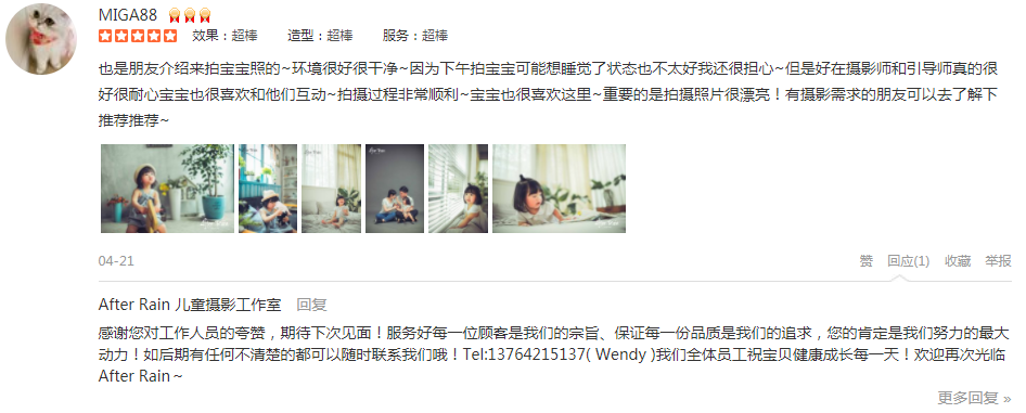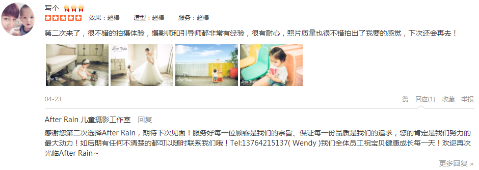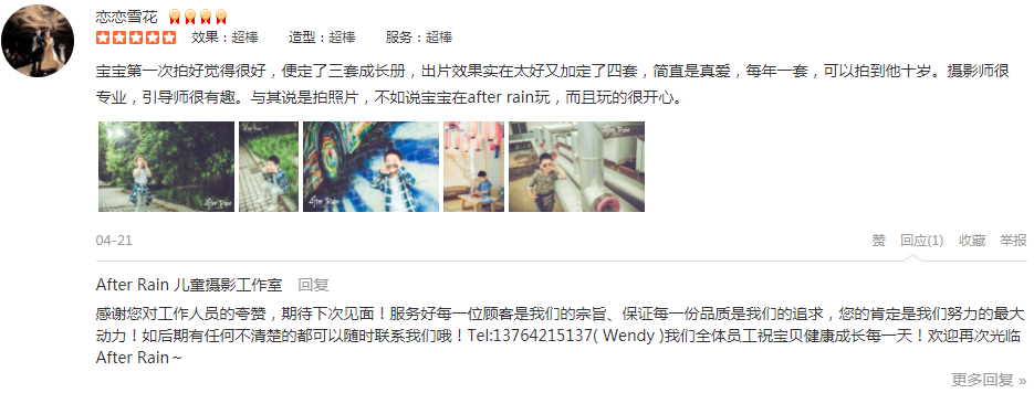 宝宝第一次拍好觉得很好,便定了三套成长册,出片效果实在太好又加定了四套,简直是真爱,每年一套,可以拍到他十岁。摄影师很专业,引导师很有趣。与其说是拍照片,不如说宝宝在after rain玩,而且玩的很开心。