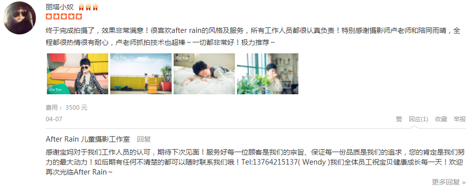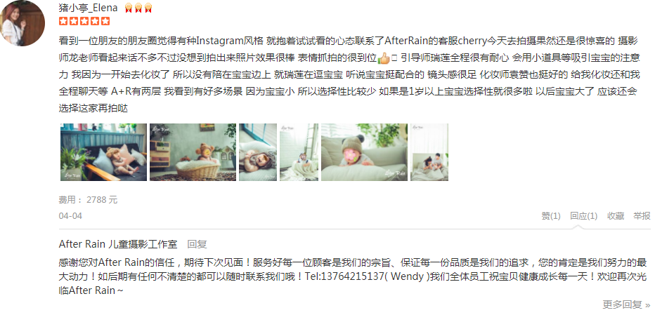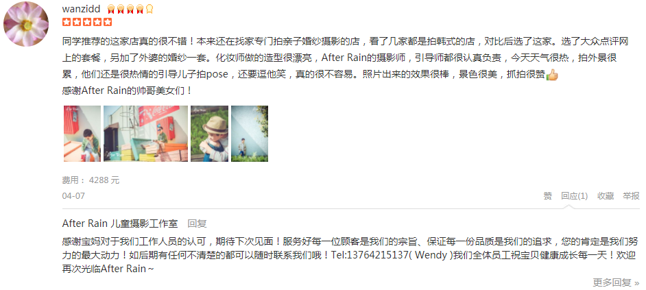 同学推荐的这家店真的很不错!本来还在找家专门拍亲子婚纱摄影的店,看了几家都是拍韩式的店,对比后选了这家。选了大众点评网上的套餐,另加了外婆的婚纱一套。化妆师做的造型很漂亮,After Rain的摄影师,引导师都很认真负...