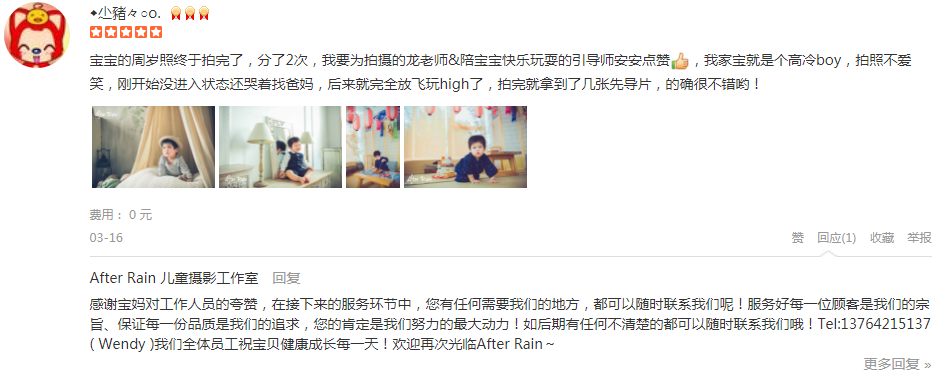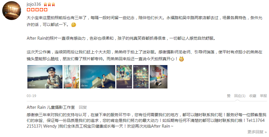 大小宝来这里拍照前后也有三年了,每隔一段时间留一些纪念,陪伴他们长大。永福路和吴中路两家店都去过,场景各具特色,条件允许的话,可以都试一下。偷笑 After Rain的照片一直很有感染力,色彩也很柔和,孩子的纯真笑容都...