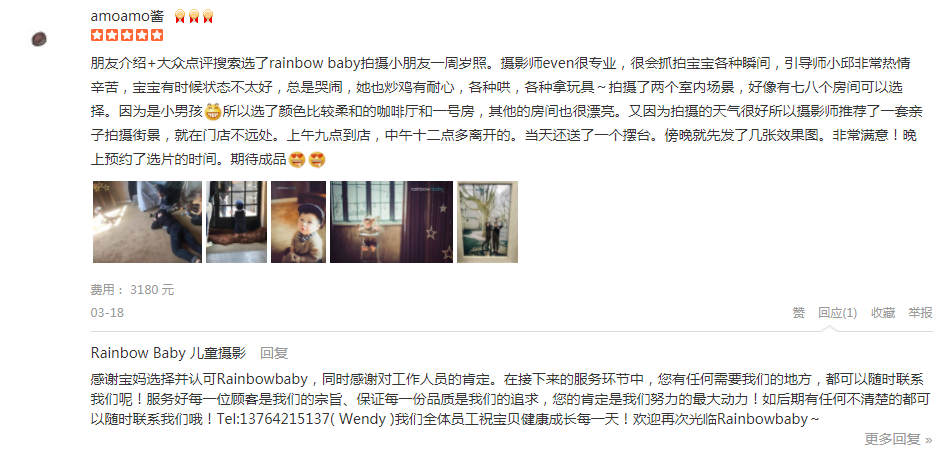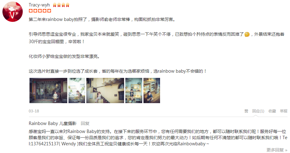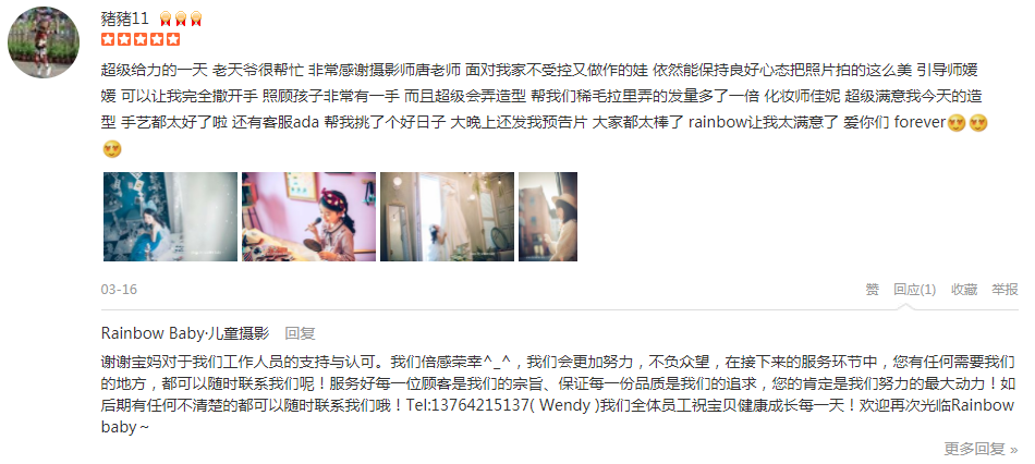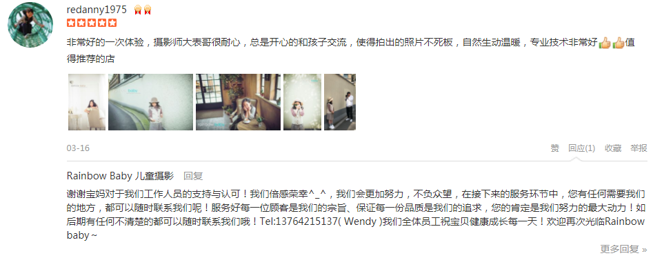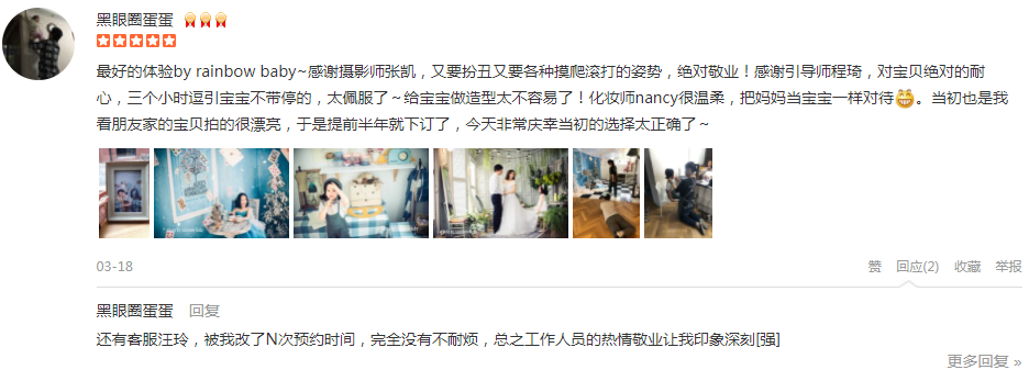 朋友介绍+大众点评搜索选了rainbow baby拍摄小朋友一周岁照。摄影师even很专业,很会抓拍宝宝各种瞬间,引导师小邱非常热情辛苦,宝宝有时候状态不太好,总是哭闹,她也炒鸡有耐心,各种哄,各种拿玩具~拍摄了两个室内场景,好...