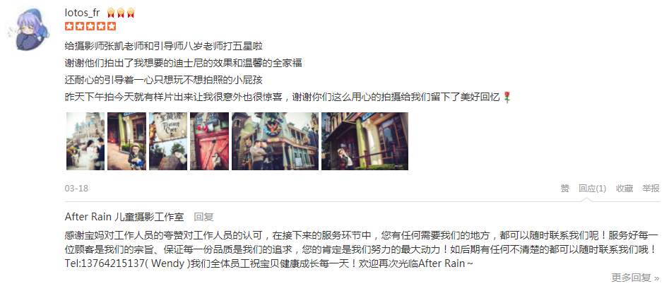 给摄影师张凯老师和引导师八岁老师打五星啦 谢谢他们拍出了我想要的迪士尼的效果和温馨的全家福 还耐心的引导着一心只想玩不想拍照的小屁孩 昨天下午拍今天就有样片出来让我很意外也很惊喜,谢谢你们这么用心的拍摄...