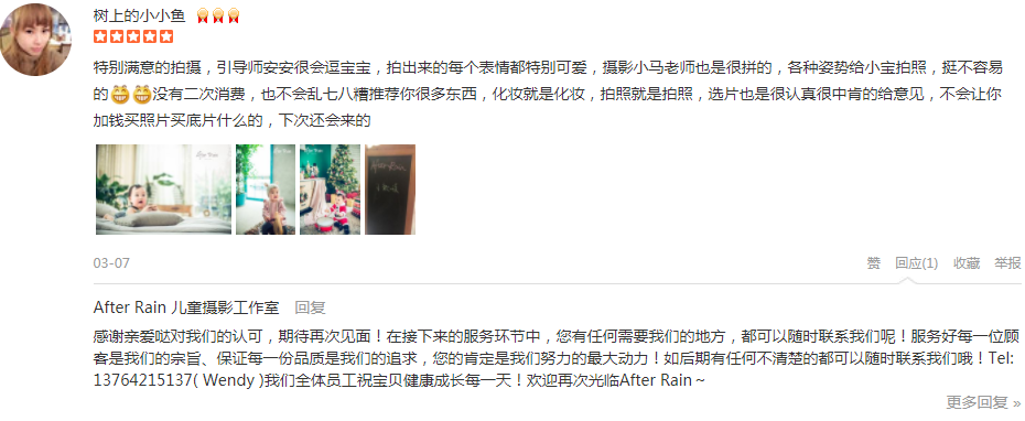 特别满意的拍摄,引导师安安很会逗宝宝,拍出来的每个表情都特别可爱,摄影小马老师也是很拼的,各种姿势给小宝拍照,挺不容易的没有二次消费,也不会乱七八糟推荐你很多东西,化妆就是化妆,拍照就是拍照,选片也是很认真很中...