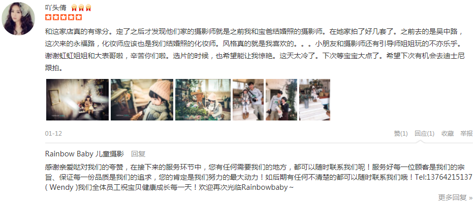 和这家店真的有缘分。定了之后才发现他们家的摄影师就是之前我和宝爸结婚照的摄影师。在她家拍了好几套了。之前去的是吴中路,这次来的永福路,化妆师应该也是我们结婚照的化妆师。风格真的就是我喜欢的。。。小朋友和摄影师还...