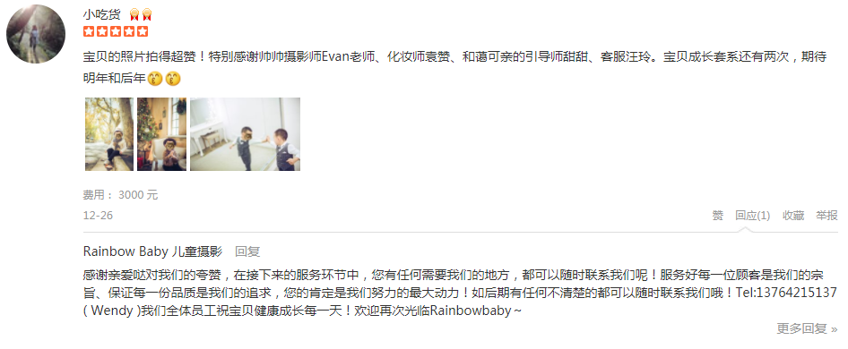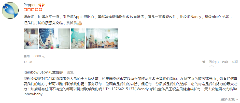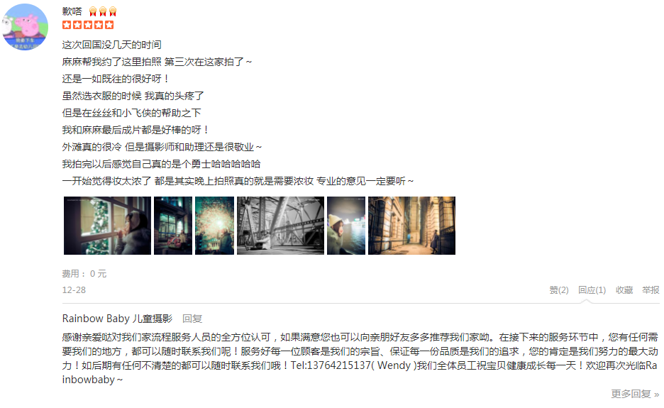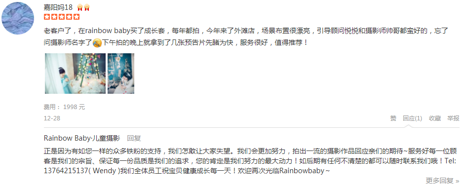 老客户了,在rainbow baby买了成长套,每年都拍,今年来了外滩店,场景布置很漂亮,引导顾问悦悦和摄影师帅哥都蛮好的,忘了问摄影师名字了捂脸下午拍的晚上就拿到了几张预告片先睹为快,服务很好,值得推荐!