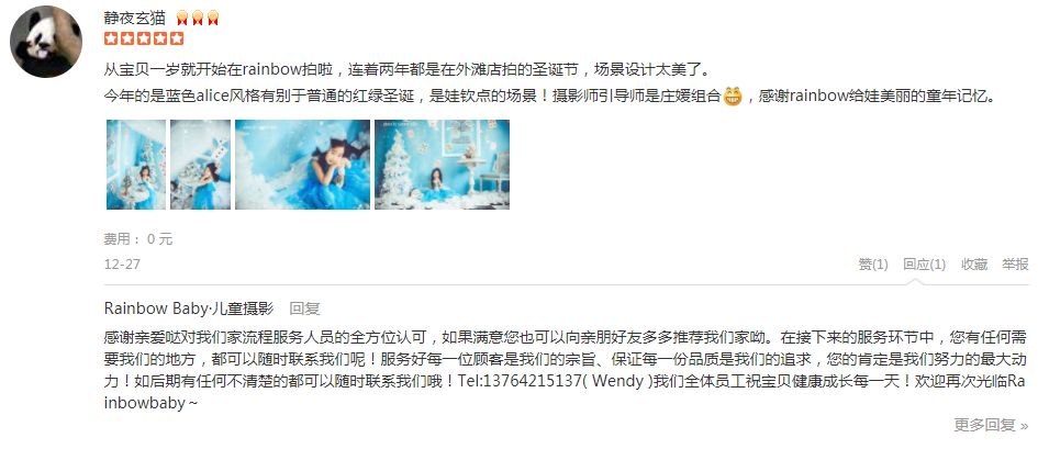 从宝贝一岁就开始在rainbow拍啦,连着两年都是在外滩店拍的圣诞节,场景设计太美了。 今年的是蓝色alice风格有别于普通的红绿圣诞,是娃钦点的场景!摄影师引导师是庄媛组合呲牙,感谢rainbow给娃美丽的童年记忆。