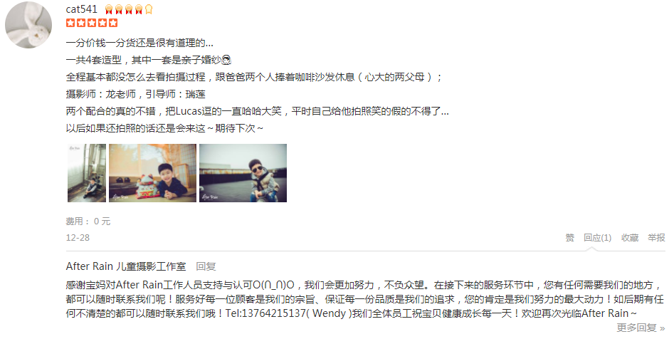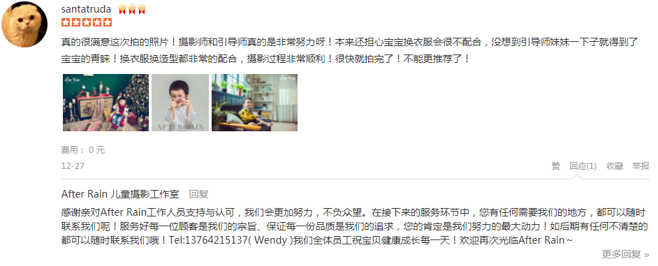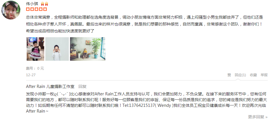 真的很满意这次拍的照片!摄影师和引导师真的是非常努力呀!本来还担心宝宝换衣服会很不配合,没想到引导师妹妹一下子就得到了宝宝的青睐!换衣服换造型都非常的配合,摄影过程非常顺利!很快就拍完了!不能更推荐了!