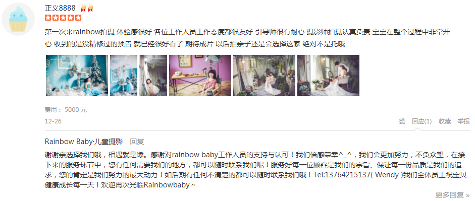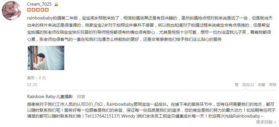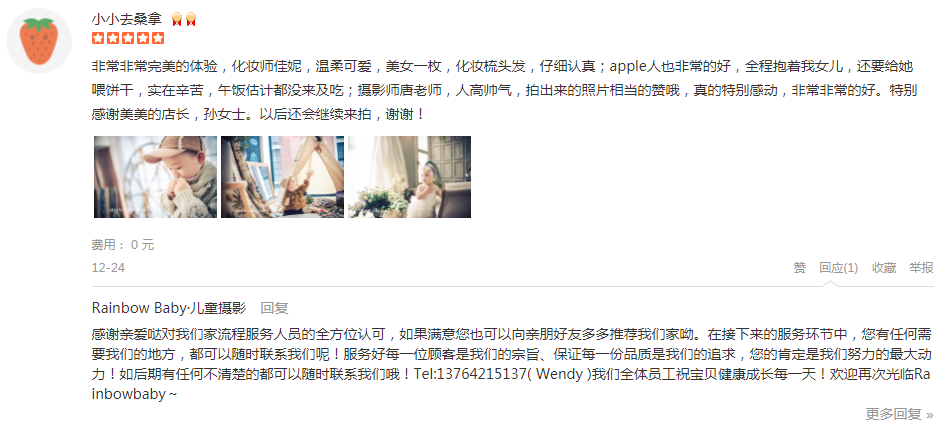 第一次来rainbow拍摄 体验感很好 各位工作人员工作态度都很友好 引导师很有耐心 摄影师拍摄认真负责 宝宝在整个过程中非常开心 收到的是没精修过的预告 就已经很好看了 期待成片 以后拍亲子还是会选择这家 绝对不是托...
