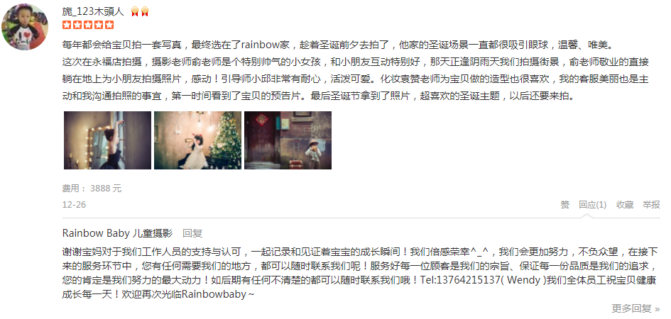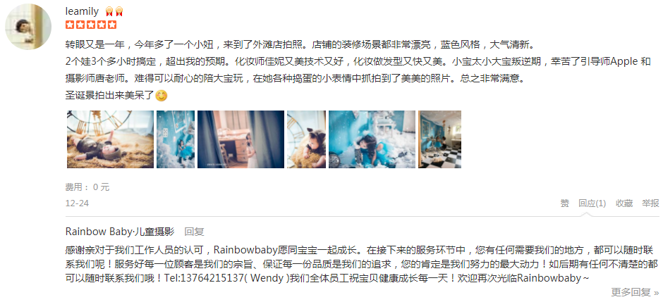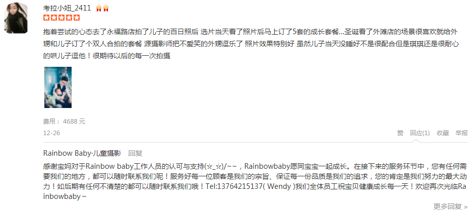 抱着尝试的心态去了永福路店拍了儿子的百日照后 选片当天看了照片后马上订了5套的成长套餐…圣诞看了外滩店的场景很喜欢就给外甥和儿子订了个双人合拍的套餐 源摄影师把不爱笑的外甥逗乐了 照片效果特别好 虽然儿子当...