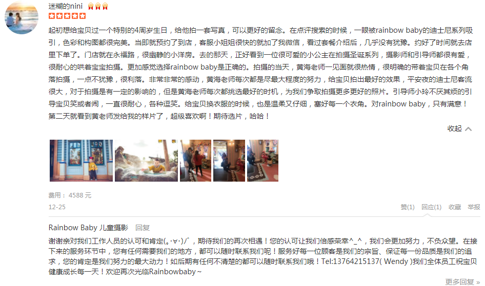 起初想给宝贝过一个特别的4周岁生日,给他拍一套写真,可以更好的留念。在点评搜索的时候,一眼被rainbow baby的迪士尼系列吸引,色彩和构图都很完美。当即就预约了到店,客服小姐姐很快的就加了我微信,看过套餐介绍后,几乎...