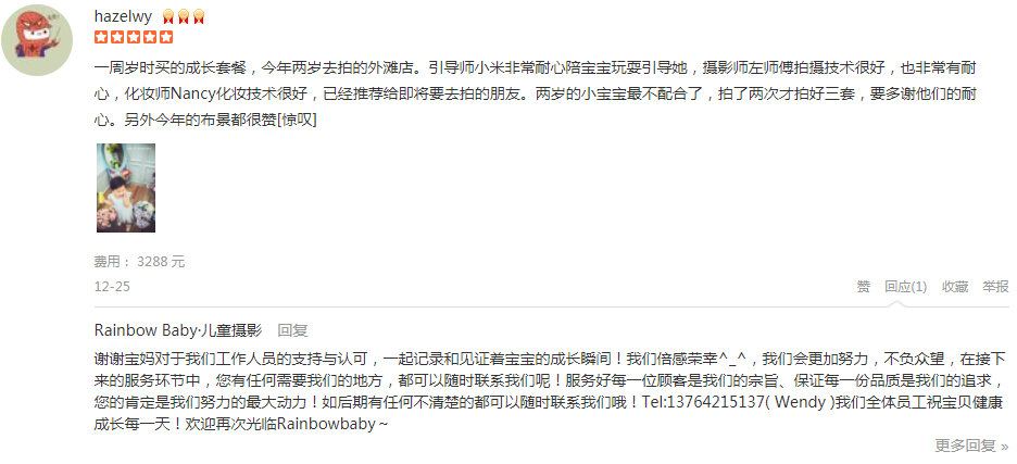 非常非常完美的体验,化妆师佳妮,温柔可爱,美女一枚,化妆梳头发,仔细认真;apple人也非常的好,全程抱着我女儿,还要给她喂饼干,实在辛苦,午饭估计都没来及吃;摄影师唐老师,人高帅气,拍出来的照片相当的赞哦,真的特别感动...