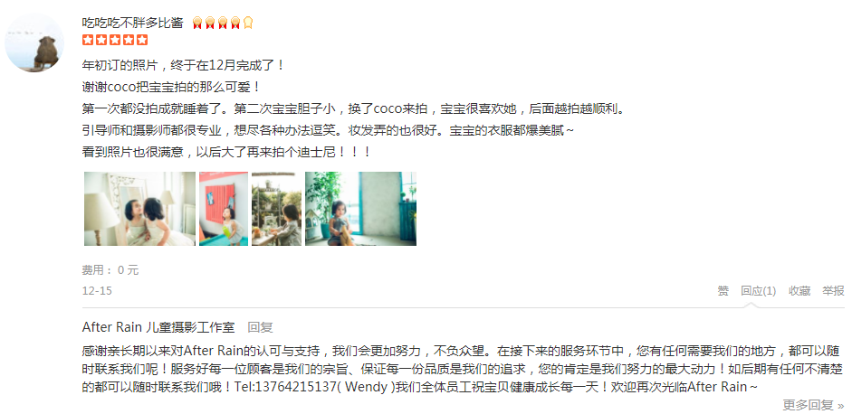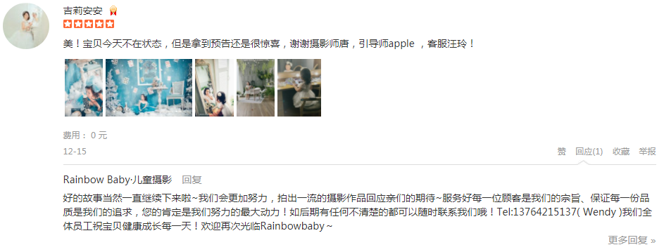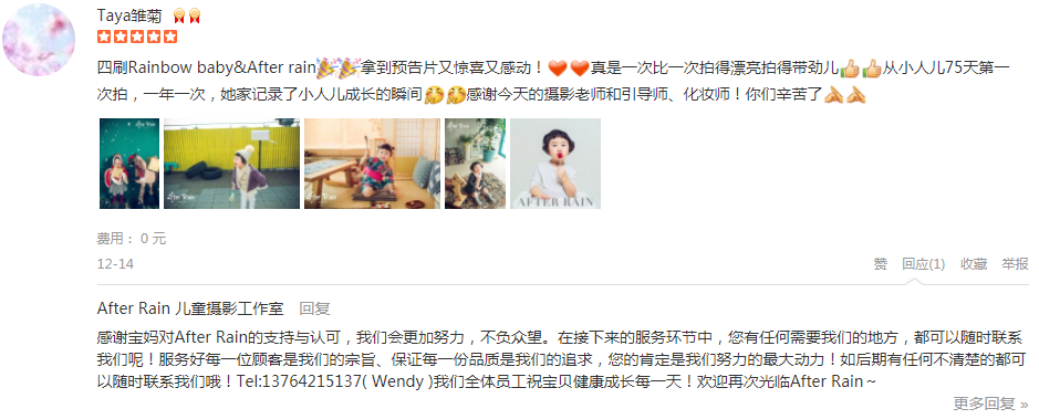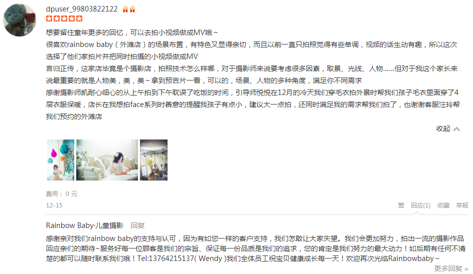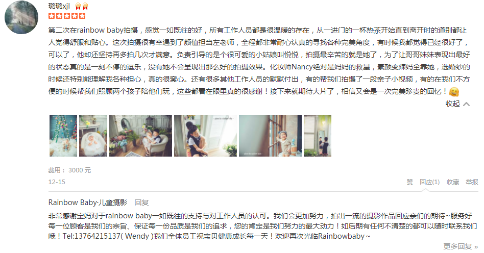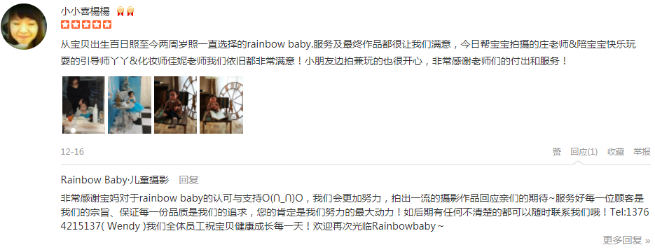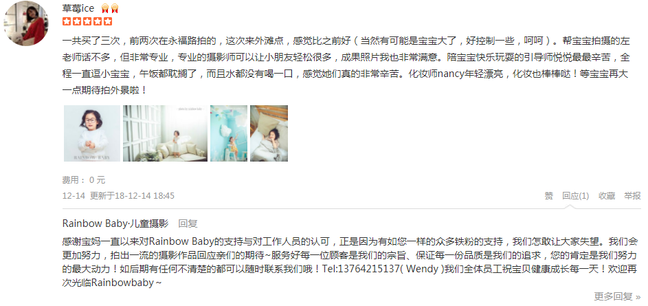 从宝贝出生百日照至今两周岁照一直选择的rainbow baby.服务及最终作品都很让我们满意,今日帮宝宝拍摄的庄老师&陪宝宝快乐玩耍的引导师丫丫&化妆师佳妮老师我们依旧都非常满意!小朋友边拍兼玩的也很开心,非常感谢老师...