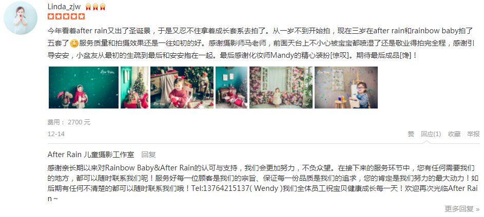 今年看着after rain又出了圣诞景,于是又忍不住拿着成长套系去拍了。从一岁不到开始拍,现在三岁在after rain和rainbow baby拍了五套了愉快服务质量和拍摄效果还是一往如初的好。感谢摄影师马老师,前面天台上不小心被宝宝...