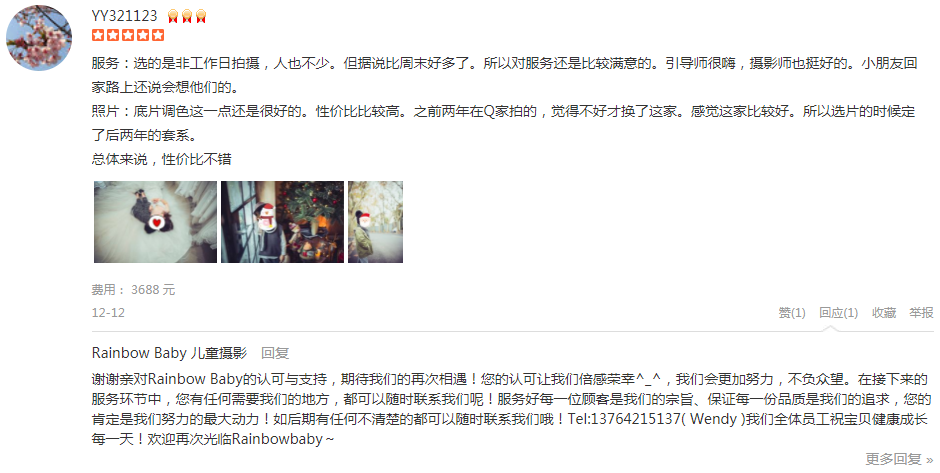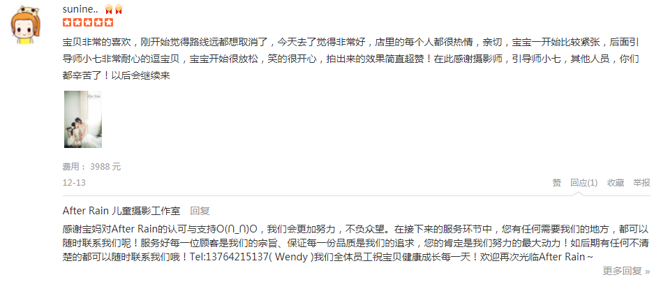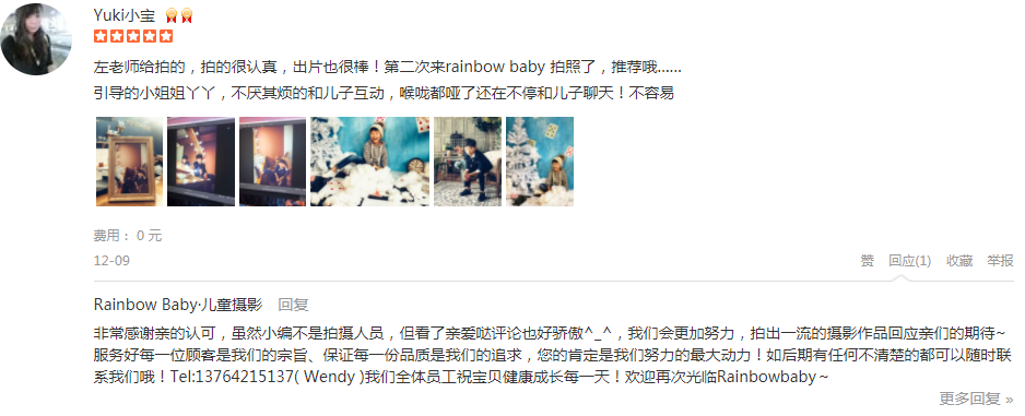 服务:选的是非工作日拍摄,人也不少。但据说比周末好多了。所以对服务还是比较满意的。引导师很嗨,摄影师也挺好的。小朋友回家路上还说会想他们的。 照片:底片调色这一点还是很好的。性价比比较高。之前两年在Q家拍的,觉得不...