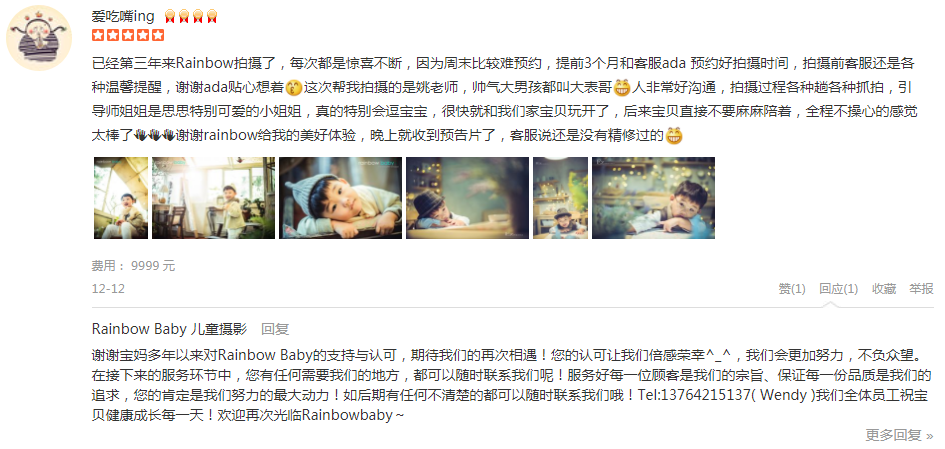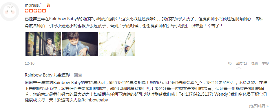已经第三年在Rainbow Baby给我们家小调皮拍摄啦!这次比以往还要难哄,我们家孩子太皮了。但摄影师小飞侠还是很有耐心,各种角度各种拍,引导小姐姐小玲也很会去逗孩子,看到片子的时候,谢谢摄影师和引导小姐姐。很专业!辛苦...
