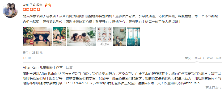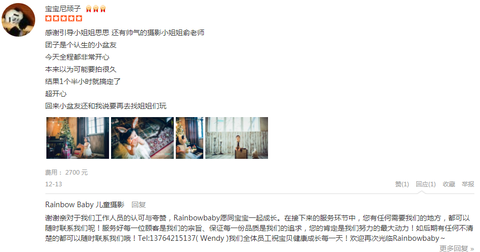 朋友推荐来到了这家店!从咨询到预约到拍摄全程都特别顺利!摄影师卢老师、引导师瑞莲、化妆师佩佩、客服程程,每一个环节都配合相当默契,服务妥帖到位!强烈推荐这家拍摄!孩子开心,妈妈放心,服务贴心!给每一位工作人员点赞...