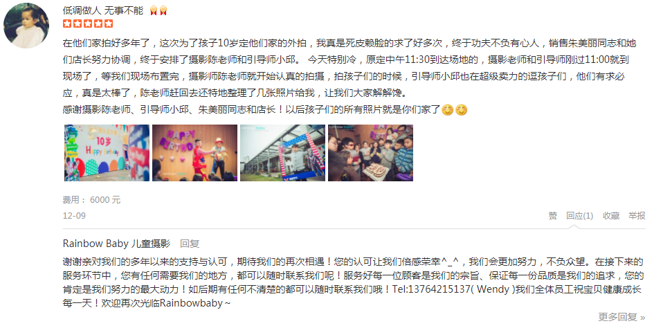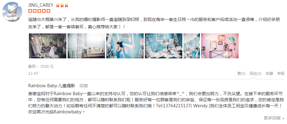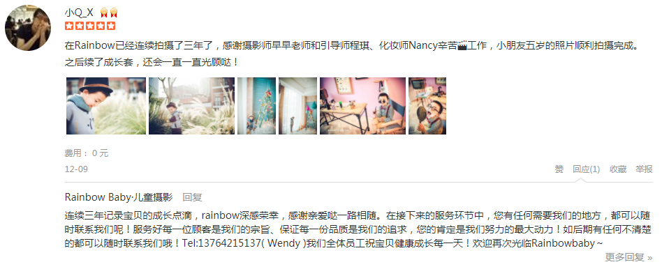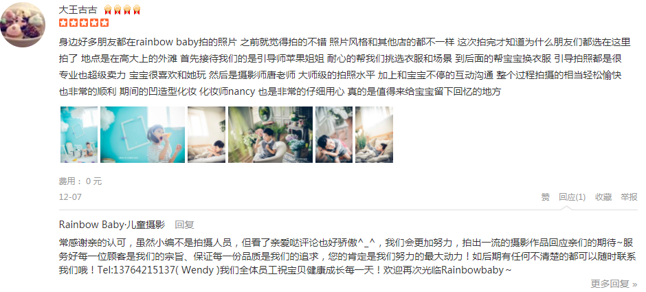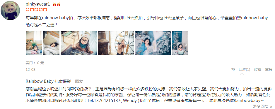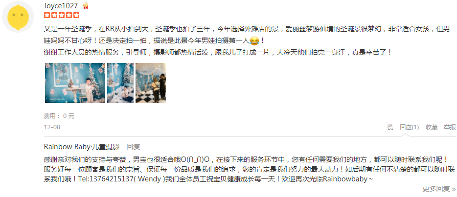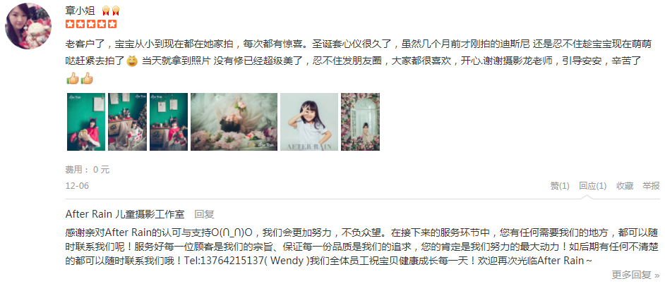 老客户了,宝宝从小到现在都在她家拍,每次都有惊喜。圣诞套心仪很久了,虽然几个月前才刚拍的迪斯尼 还是忍不住趁宝宝现在萌萌哒赶紧去拍了憨笑 当天就拿到照片 没有修已经超级美了,忍不住发朋友圈,大家都很喜欢,开心.谢...
