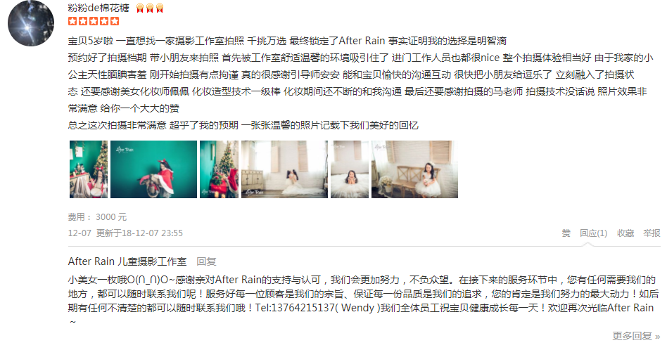 宝贝5岁啦 一直想找一家摄影工作室拍照 千挑万选 最终锁定了After Rain 事实证明我的选择是明智滴 预约好了拍摄档期 带小朋友来拍照 首先被工作室舒适温馨的环境吸引住了 进门工作人员也都很nice 整个拍摄体验相当好...
