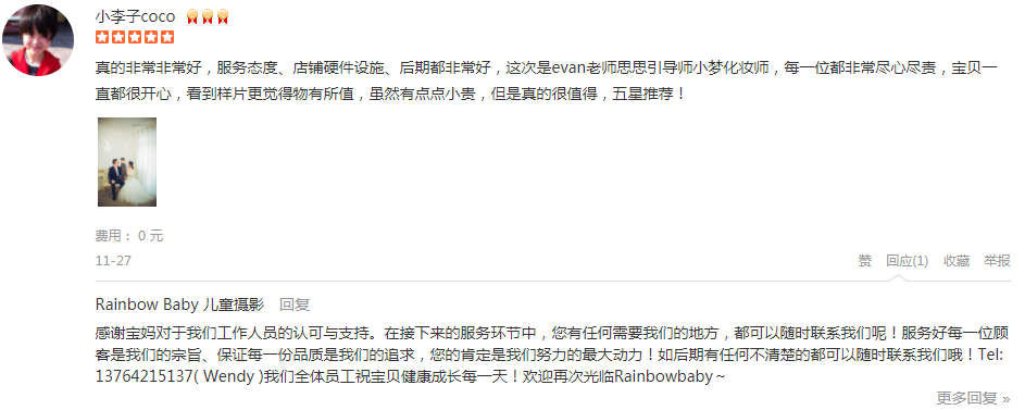 真的非常非常好,服务态度、店铺硬件设施、后期都非常好,这次是evan老师思思引导师小梦化妆师,每一位都非常尽心尽责,宝贝一直都很开心,看到样片更觉得物有所值,虽然有点点小贵,但是真的很值得,五星推荐!
