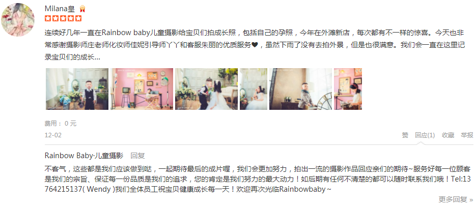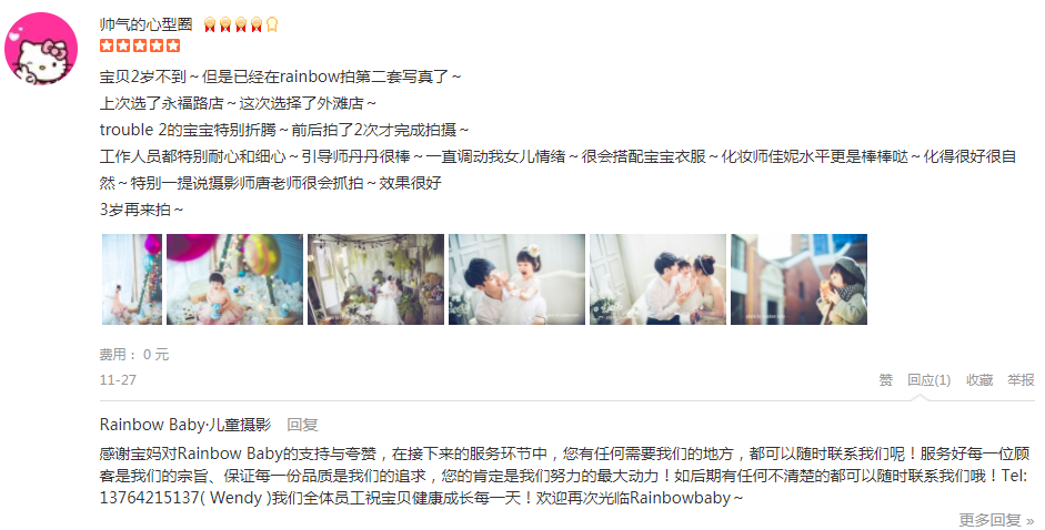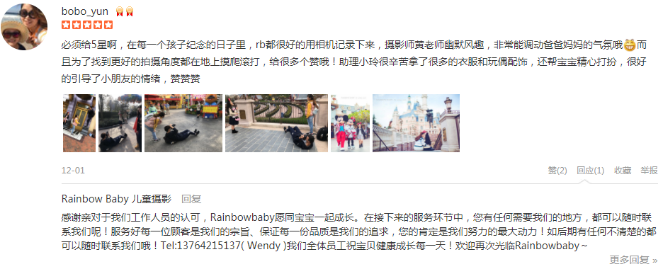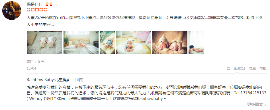 必须给5星啊,在每一个孩子纪念的日子里,rb都很好的用相机记录下来,摄影师黄老师幽默风趣,非常能调动爸爸妈妈的气氛哦呲牙而且为了找到更好的拍摄角度都在地上摸爬滚打,给很多个赞哦!助理小玲很辛苦拿了很多的衣服和玩...