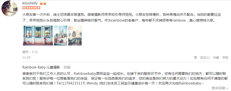 小朋友第一次外拍,迪士尼场景非常漂亮。感谢摄影师早早和引导师悦悦。小朋友性格慢热,各种表情动作不配合。当妈的都要吐血了,早早悦悦从头到尾耐心引导,敬业精神绝对服气。作为rainbow的老客户,每年都不厌其烦夸夸rainbo...