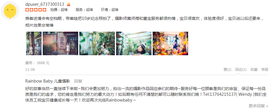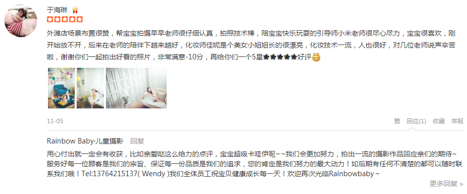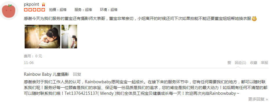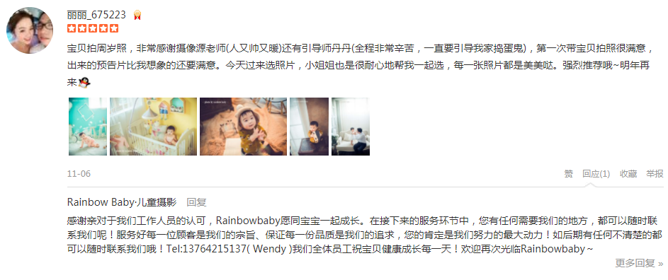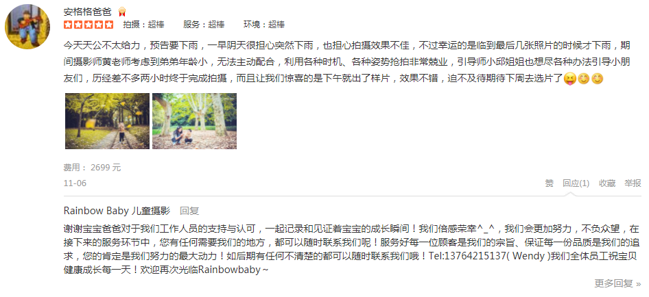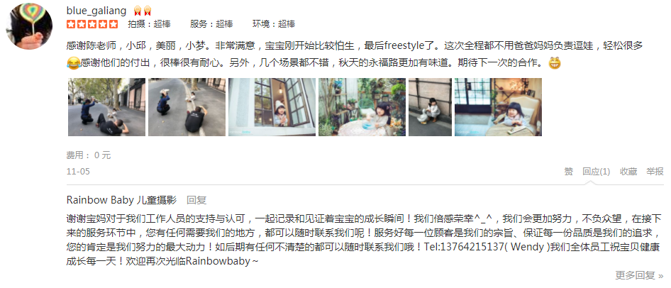感谢陈老师,小邱,美丽,小梦。非常满意,宝宝刚开始比较怕生,最后freestyle了。这次全程都不用爸爸妈妈负责逗娃,轻松很多笑哭感谢他们的付出,很棒很有耐心。另外,几个场景都不错,秋天的永福路更加有味道。期待下一次的合作...