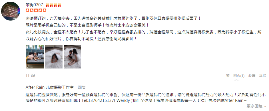 老婆预订的,昨天抽空去,因为进博会的关系我们才算预约到了,否则双休日真得要排到很后面了! 照片是用手机自己拍的,不是出自摄影师手!等底片出来应该会更美! 女儿比较调皮,全程不太配合!儿子也不配合,幸好程程客服安...