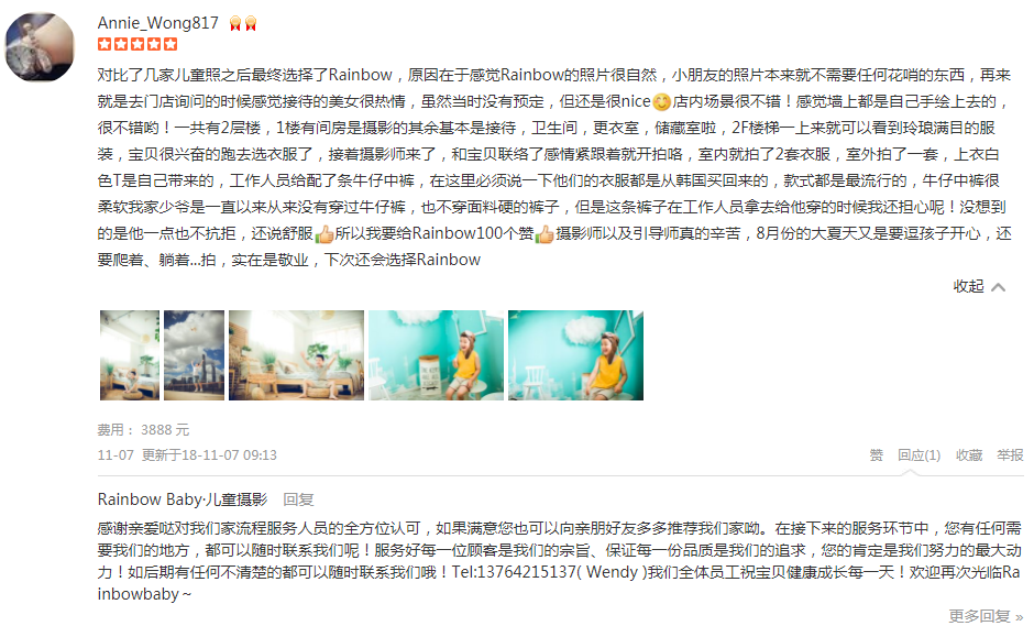 对比了几家儿童照之后最终选择了Rainbow,原因在于感觉Rainbow的照片很自然,小朋友的照片本来就不需要任何花哨的东西,再来就是去门店询问的时候感觉接待的美女很热情,虽然当时没有预定,但还是很nice愉快店内场景很不错...