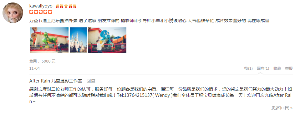 宝宝5岁写真选了吴中路店拍摄,果然没有让我失望。摄影师卢老师引导师小七非常给力,和娃交流互动毫无压力,小朋友今天状态也非常好。收到的预告片每张都很赞,特别是穿迷彩服的团结系列,非常cool。今天还拍了亲子婚纱,感谢...