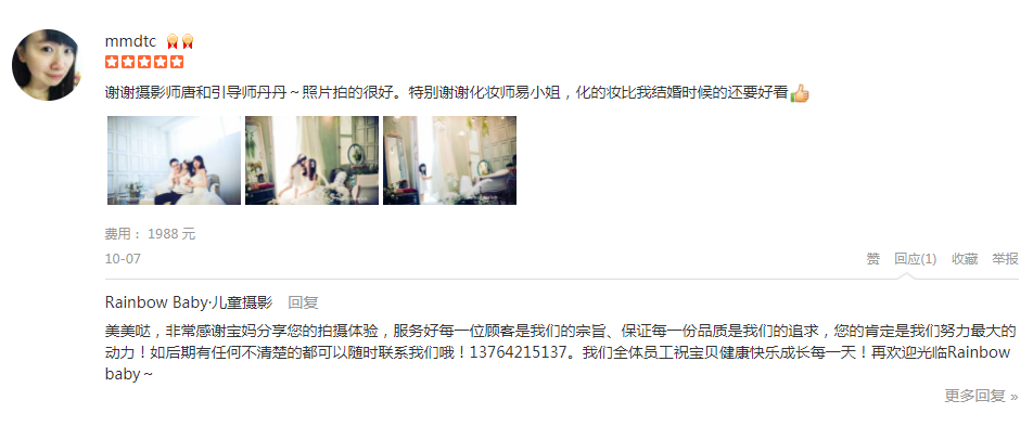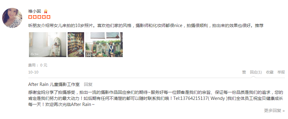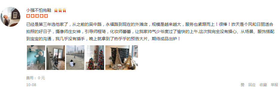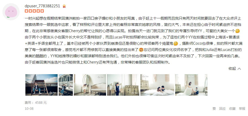 一时兴起想在假期结束回澳洲前拍一家四口亲子婚纱和小朋友的写真,由于赶上十一假期而且我只有两天时间就要回去了在大众点评上搜索结果中一眼就选中这家,看了样照和评论里大家上传的客照非常喜欢她家的风格,简约大气,...
