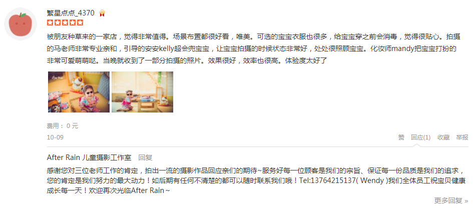 被朋友种草来的一家店,觉得非常值得。场景布置都很好看,唯美。可选的宝宝衣服也很多,给宝宝穿之前会消毒,觉得很贴心。拍摄的马老师非常专业亲和,引导的安安kelly超会兜宝宝,让宝宝拍摄的时候状态非常好,处处很照顾宝宝。...
