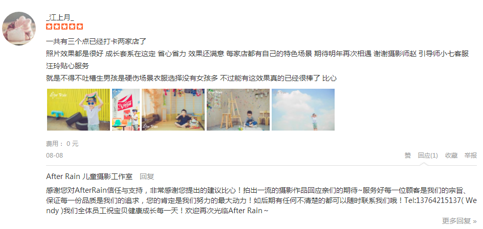 一共有三个点已经打卡两家店了 照片效果都是很好 成长套系在这定 省心省力 效果还满意 每家店都有自己的特色场景 期待明年再次相遇 谢谢摄影师赵 引导师小七客服汪玲贴心服务 就是不得不吐槽生男孩是硬伤场景衣服...