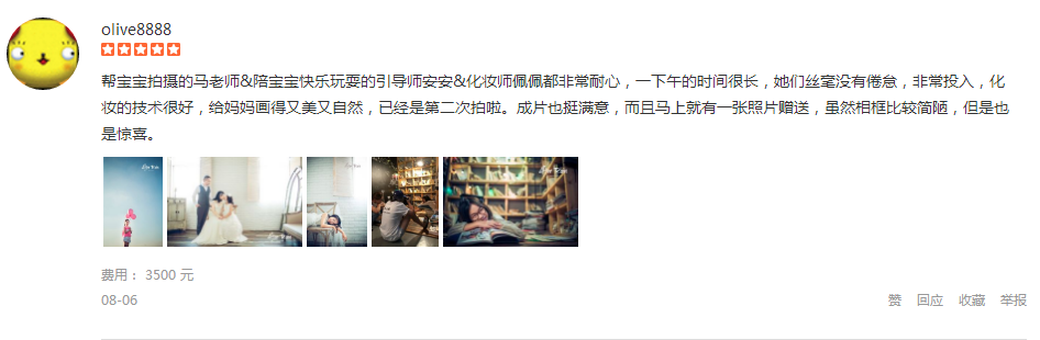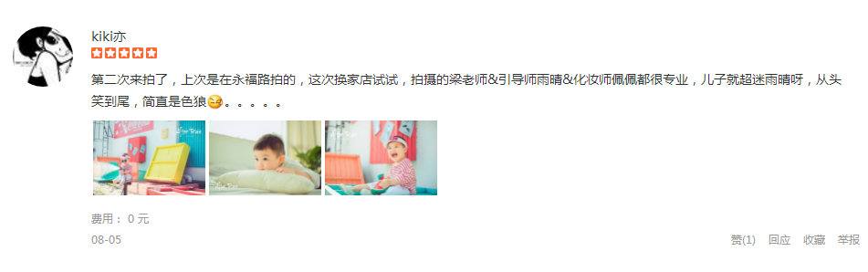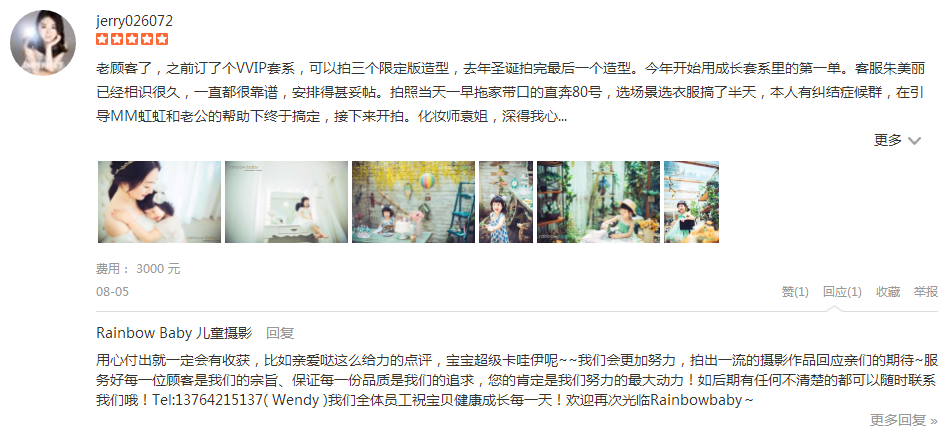 老顾客了,之前订了个VVIP套系,可以拍三个限定版造型,去年圣诞拍完最后一个造型。今年开始用成长套系里的第一单。客服朱美丽已经相识很久,一直都很靠谱,安排得甚妥帖。拍照当天一早拖家带口的直奔80号,选场景选衣服搞了半...