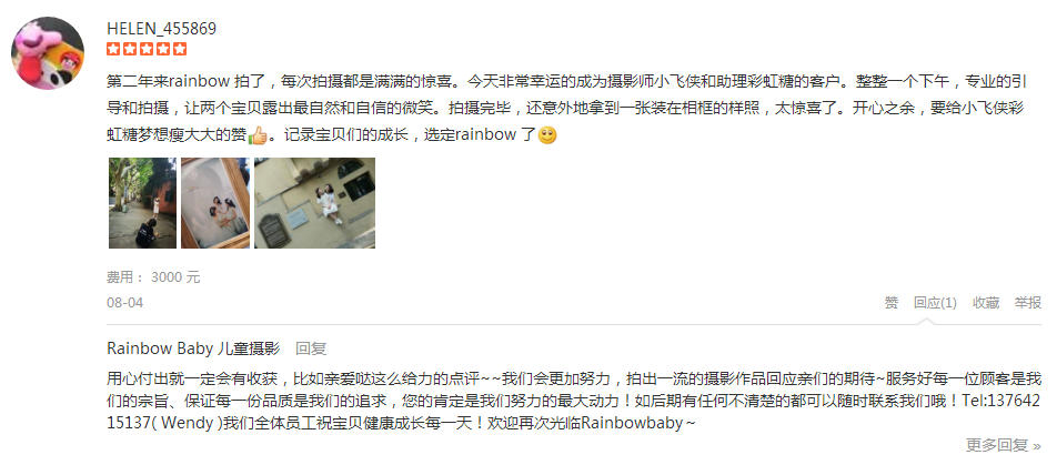 第二年来rainbow 拍了,每次拍摄都是满满的惊喜。今天非常幸运的成为摄影师小飞侠和助理彩虹糖的客户。整整一个下午,专业的引导和拍摄,让两个宝贝露出最自然和自信的微笑。拍摄完毕,还意外地拿到一张装在相框的样照,太惊...