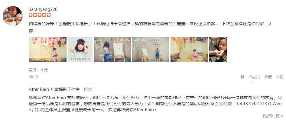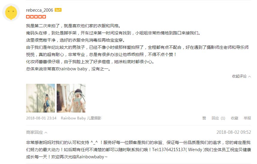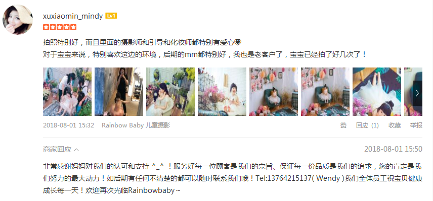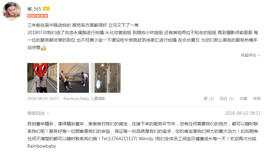 三年前在吴中路店拍的 感觉各方面都很好 立马又下了一单 20180730我们选了总店永福路进行拍摄 从化妆袁姐姐 到跟拍小林姐姐 还有其他两位不知名的姐姐 再到摄影师俞哥哥 每一位的服务都非常的到位 也不枉费小宝一下...