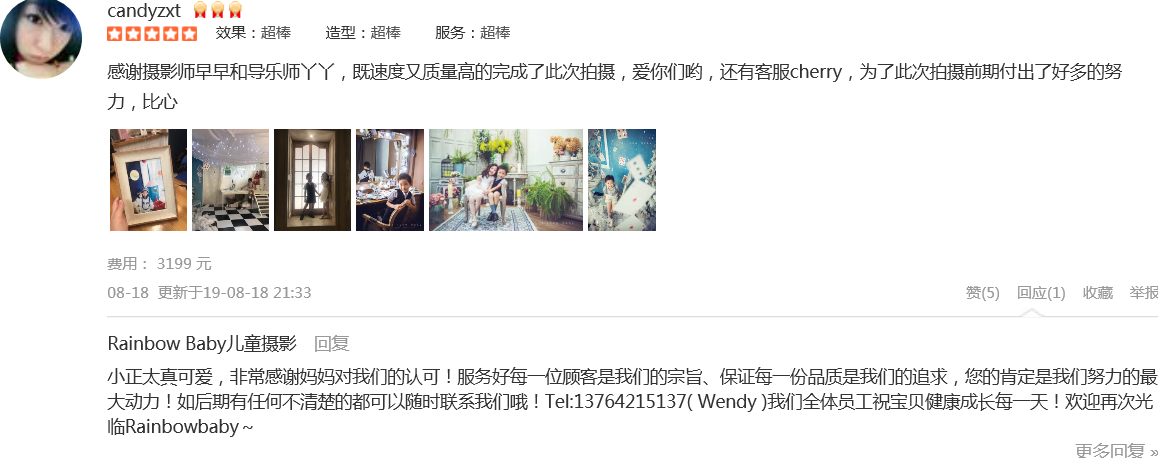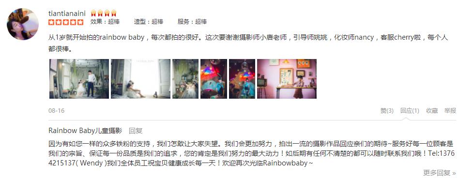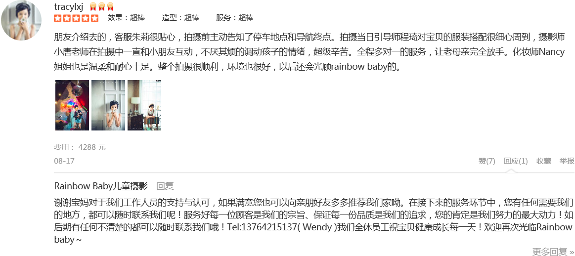 朋友介绍去的,客服朱莉很贴心,拍摄前主动告知了停车地点和导航终点。拍摄当日引导师程琦对宝贝的服装搭配很细心周到,摄影师小唐老师在拍摄中一直和小朋友互动,不厌其烦的调动孩子的情绪,超级辛苦。全程多对一的服务,让...
