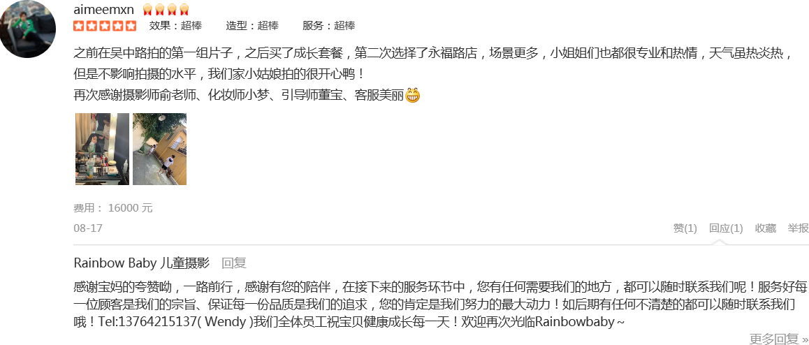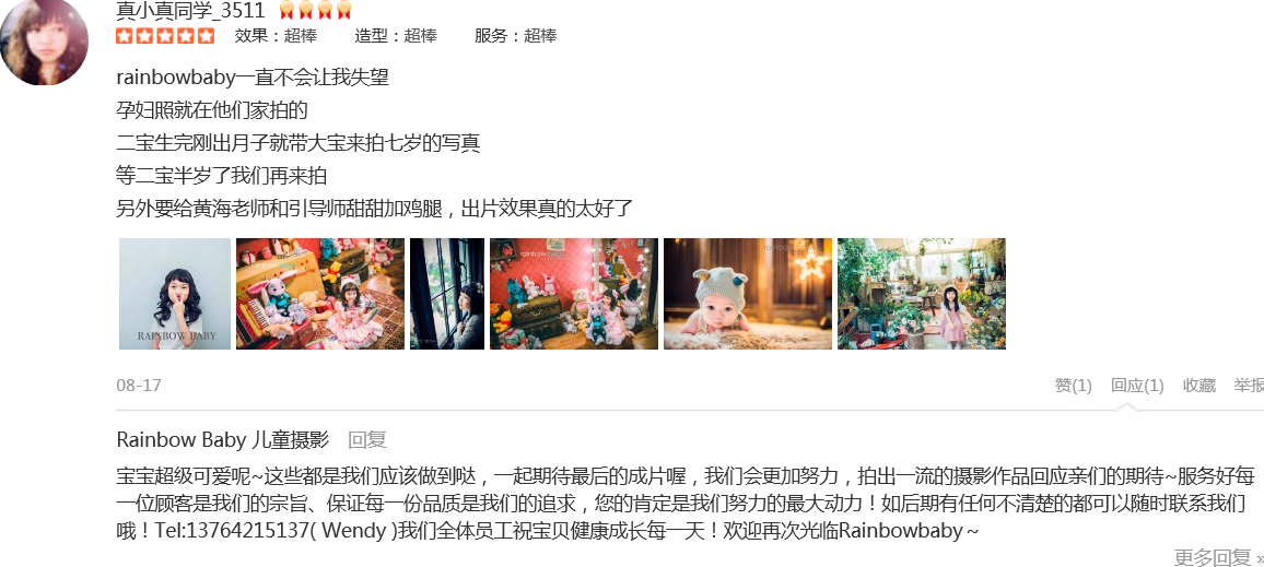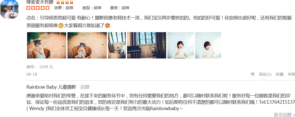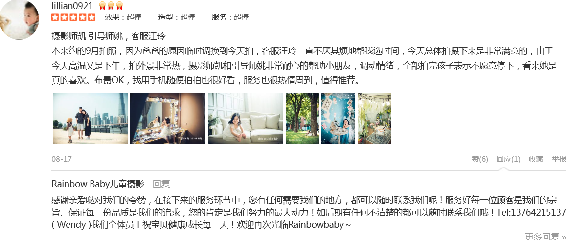 追随rainbowbaby多年,拍的一直是内景,6周岁选择外拍,客服Ada,有问必答,拍摄的时候小朋友全程high的不得了,那么热的天,摄影师露娜各种躺,从天亮拍到晚上,引导师安安超级细心,时不时提醒我记得喷防蚊水,辛苦辛苦!