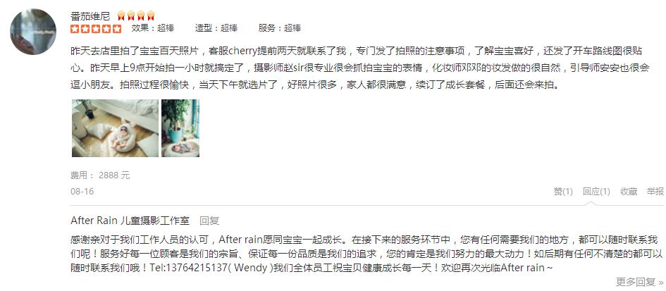 昨天去店里拍了宝宝百天照片,客服cherry提前两天就联系了我,专门发了拍照的注意事项,了解宝宝喜好,还发了开车路线图很贴心。昨天早上9点开始拍一小时就搞定了,摄影师赵sir很专业很会抓拍宝宝的表情,化妆师邓邓的妆发做...