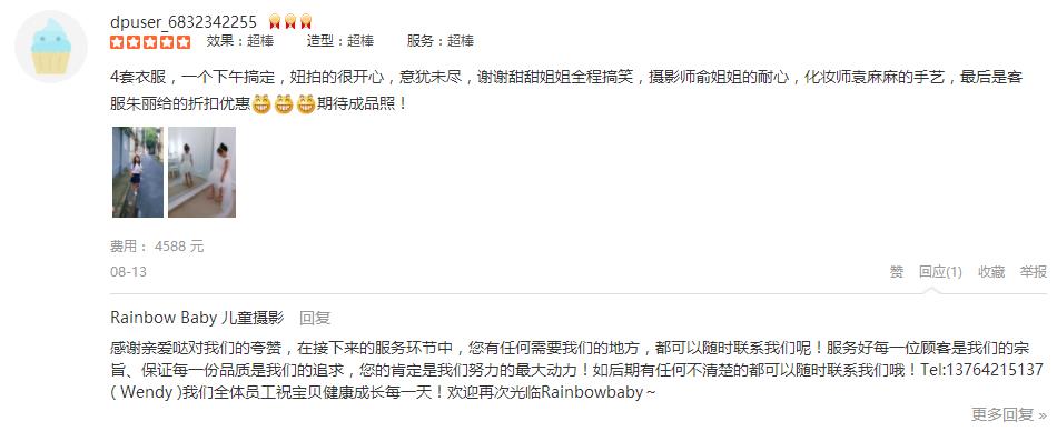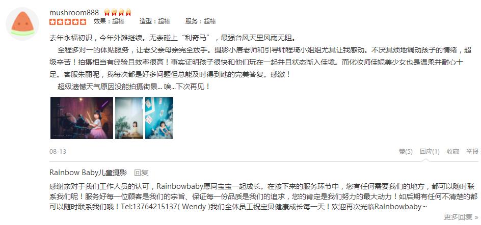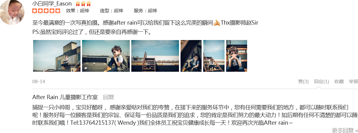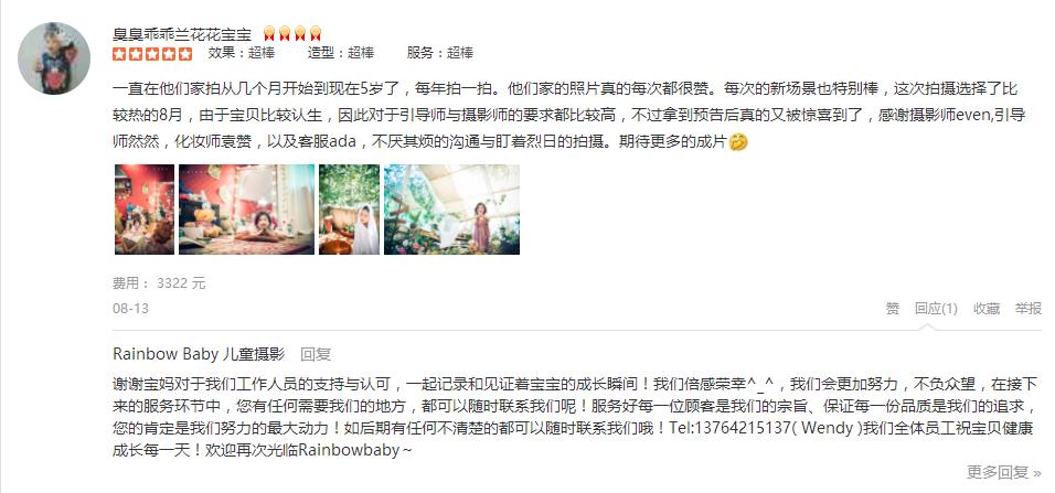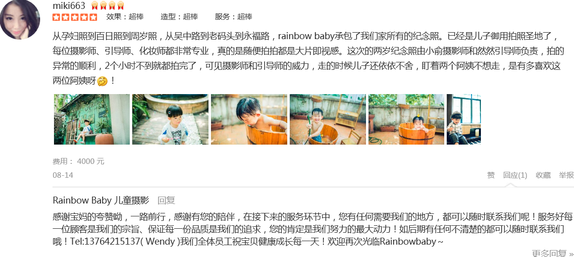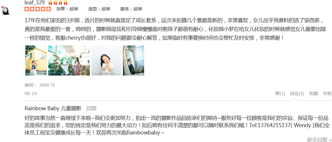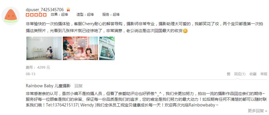 非常愉快的一次拍摄体验,客服Cherry耐心的解答导购,摄影师非常专业,摄影助理太可爱的,我都笑花了妆,两个宝贝都是第一次拍摄这类照片,光看到几张样片就已经惊艳了,非常满意,老公说这是这次回国最大的收货愉快