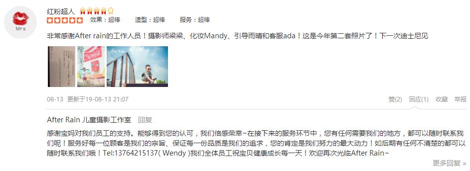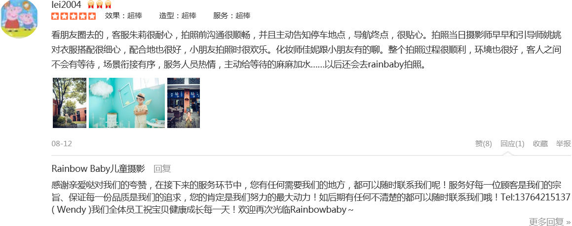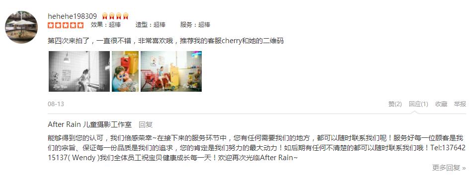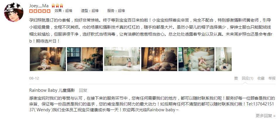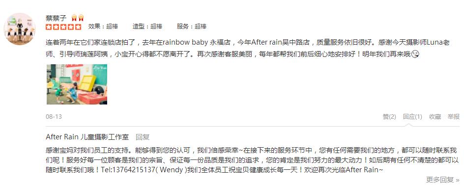 连着两年在它们家连锁店拍了,去年在rainbow baby 永福店,今年After rain吴中路店,质量服务依旧很好。感谢今天摄影师Luna老师、引导师瑞莲阿姨,小宝开心得都不愿离开了。再次感谢客服美丽,每年都帮我们前后细心地安排好!...